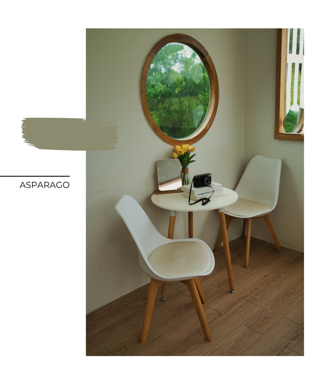 Asparago è un verde, con riflessi marrone chiaro e gialli, una tinta originale nel suo insieme ma sobria che ben si abbina con colori chiari e vari tipi di arredo.